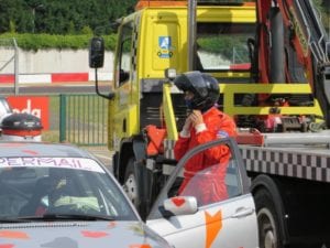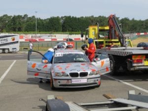 13:20, tijd voor ons voor de tweede sessie op te stellen. Wij waren nog net niet aan de beurt om de baan op rijden, en toen was het alweer prijs. De eerste twee auto’s die de baan op gingen, reden zich in de tweede bocht van de baan af. Weer een rode vlag, echter duurde dit zeker een 25 minuten voordat alles opgeruimd en vrij was. Er bleven dus nog maar 15 minuten over om te rijden. Echter konden wij deze niet volmaken. Oorzaak, een kapotte koppeling… Wij reden net op het laatste stuk voor de pit-ingang, toen de auto alleen nog maar toeren maakte maar geen meter meer voorruit kwam. Gelukkig konden wij zo rechtdoor de pits in rollen, maar niet ver genoeg tot op de paddock. Dus, de sleepdienst moest er aan te pas komen. Omdat we vrij kort bij het hek van de sleepdienst stonden konden zij ons het laatste stukje even duwen tot op onze paddock plaats.