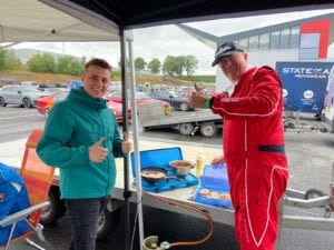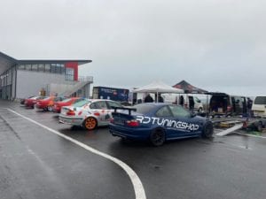 Eenmaal aangekomen alles af- en uitgeladen. Tentje opgezet voor de miezer, ook had het al de hele nacht/ochtend geregend. Wat zorgde voor een spectaculaire en uitdagende eerste ontmoeting met de baan! Glibberen en glijden, zorgen dat de auto op de baan blijft. Ik denk dat we de eerste paar rondjes meer dwars als rechtdoor gereden hebben. Wel erg leuk natuurlijk, en top voor het beter leren kennen van je wagen. Niet alleen de baan was nieuw, ook de remmen moesten eerst nog in geremd worden. Na dat dit gebeurd was kon er later en harder geremd worden. Wat het dus mogelijk maakt om mensen uit te kunnen remmen voor een bocht.