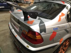 We zijn begonnen met het plaatsen van een Carbon achtervleugel, deze gaat er voor zorgen dat de auto zich beter gedraagt in de bochten. En dan met name in de hoge snelheidsbochten. De auto wordt dan meer naar het wegdek gedrukt.