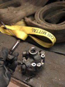 Verder moesten wij de stuurpomp nog vervangen, deze was ook sinds de laatste Trackday stuk gegaan. Dit is een bekend probleem. De as waarmee de poellie en de pomp mee verbonden zijn breekt in tweeën.