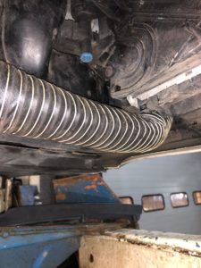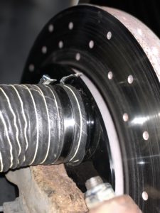 Hier wordt weer een slang op gemonteerd die voor naar de bumper loopt om de frisse/koude lucht op te vangen. In eerste instantie hadden wij deze in de originele remkoelings schachten gelegd. Echter toen wij weer de wielen erop hadden gezet en het stuur volledig in draaiden, kwam de wielen tegen de slangen aan. We moesten de slangen dus verleggen.