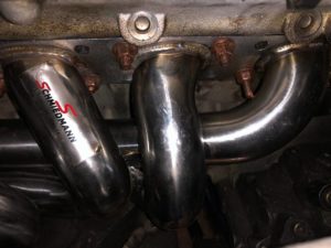 Na dat wij de inlaat gedeeltelijk hebben aangepast, is het tijd voor de uitlaat. Wij hebben gekozen voor een spruitstuk en middenpijp van Schmiedmann. Dit was helaas toch niet een eenvoudig klusje, dit omdat de 6-in lijn schuin in de motorruimte ligt. Hierdoor kun je de moertjes van het spruitstuk slecht zien.