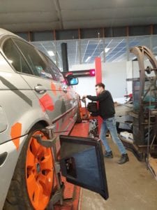 Het uitlijnen mochten wij doen in de garage van Autobedrijf Moorthaemer. De eigenaar, Jan Moorthaemer, rijdt sinds kort ook mee met onze vaste Trackday groep.